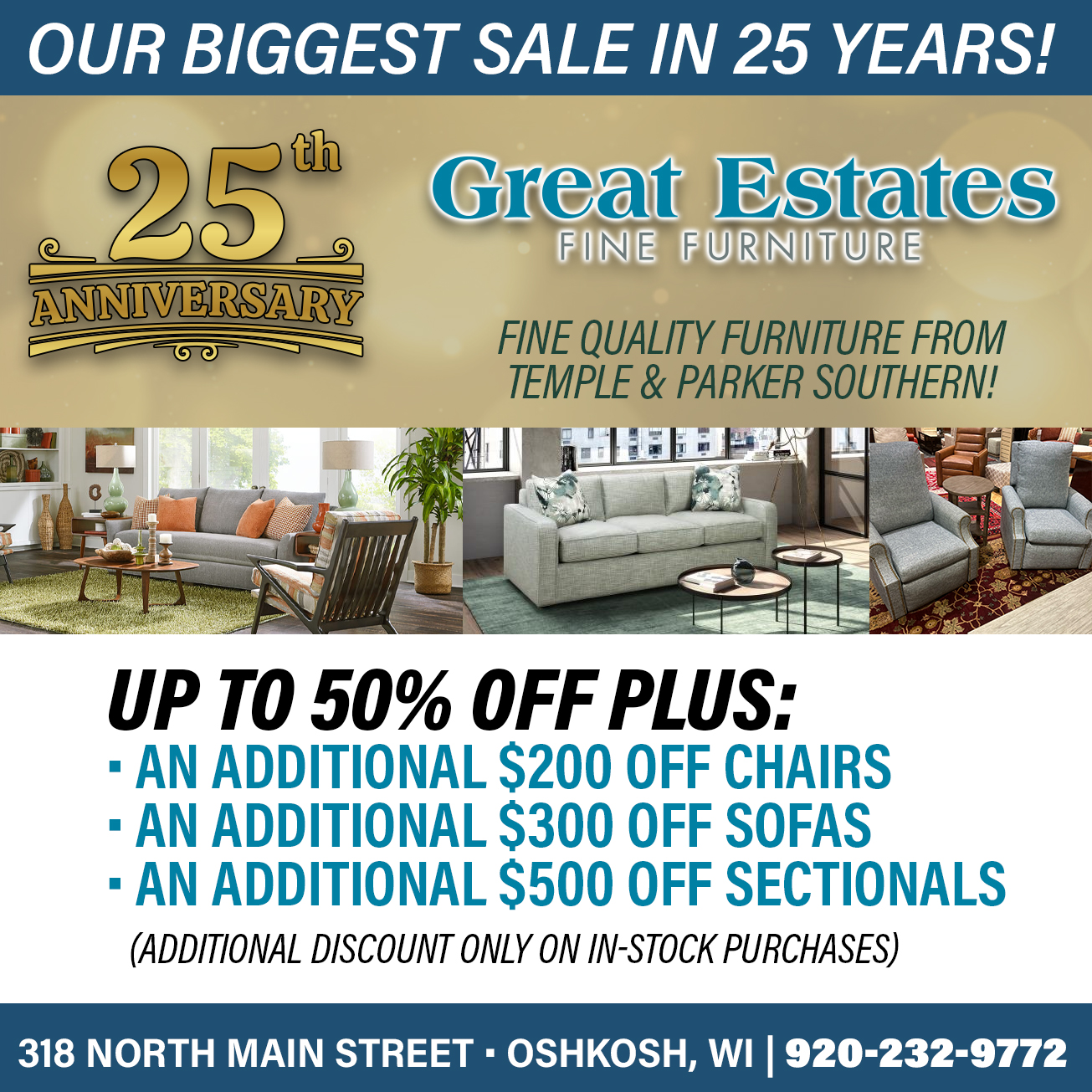 At Great Estates Furniture in Oshkosh, WI, we specialize in fine furniture at prices you can’t find anywhere else! Stop in today to see what is on our showroom floor, or ask about how you can customize a piece of furniture for your own style and decor! You can’t do that at a big-box store.